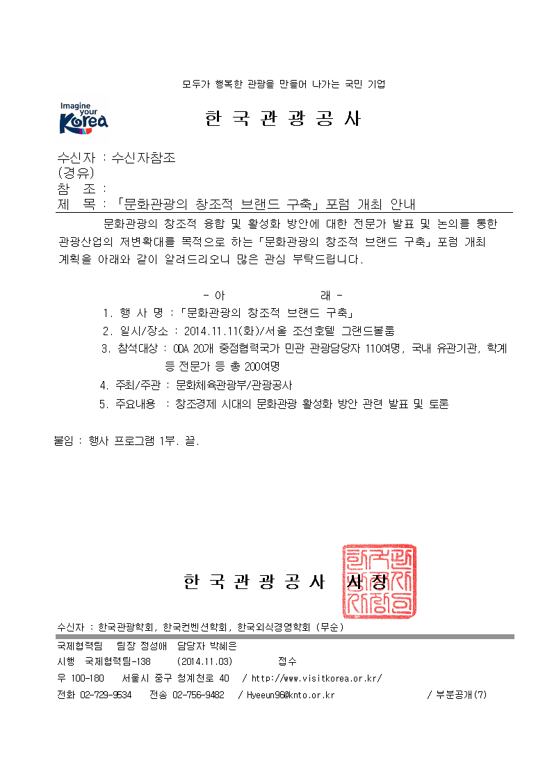 하는 "문화관광의 창조적 브랜드 구축"포럼 개최 계획을 아래과 같이 알려드리오니 많은 관심 부탁드립니다.