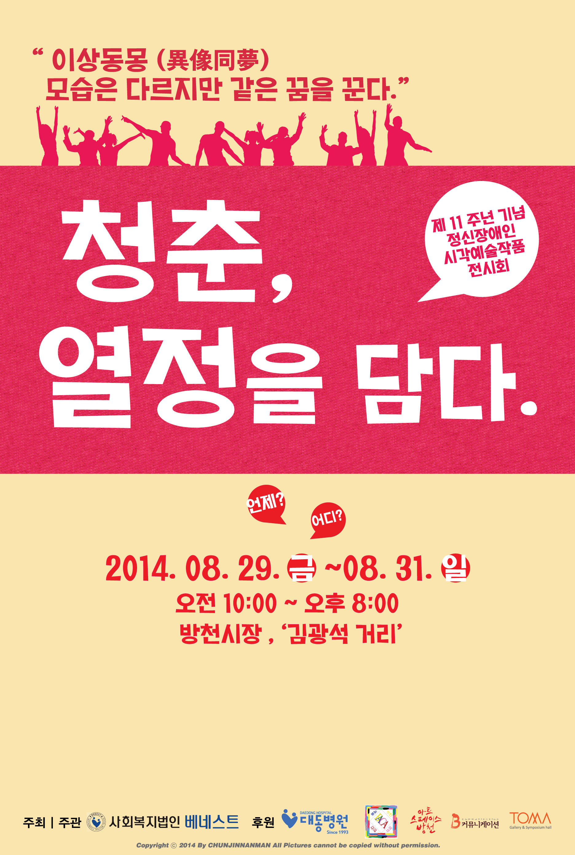 올해로 11주년 을 맞이하는 이상동몽은 '청춘! 열정을 담다'라는 주제로 정신장애인의 시각예술작품 전시와 함께 대구의 관광명소인 김광석거리에서 많은 작가분들과 함께 의미있는 문화축제를 열고자 합니다.