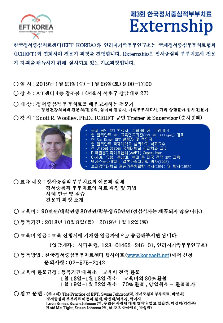 제3회 한국정서중심적부부치료 Externship이 열립니다. 2019년 1월 23일(수) - 1월 26일(토)