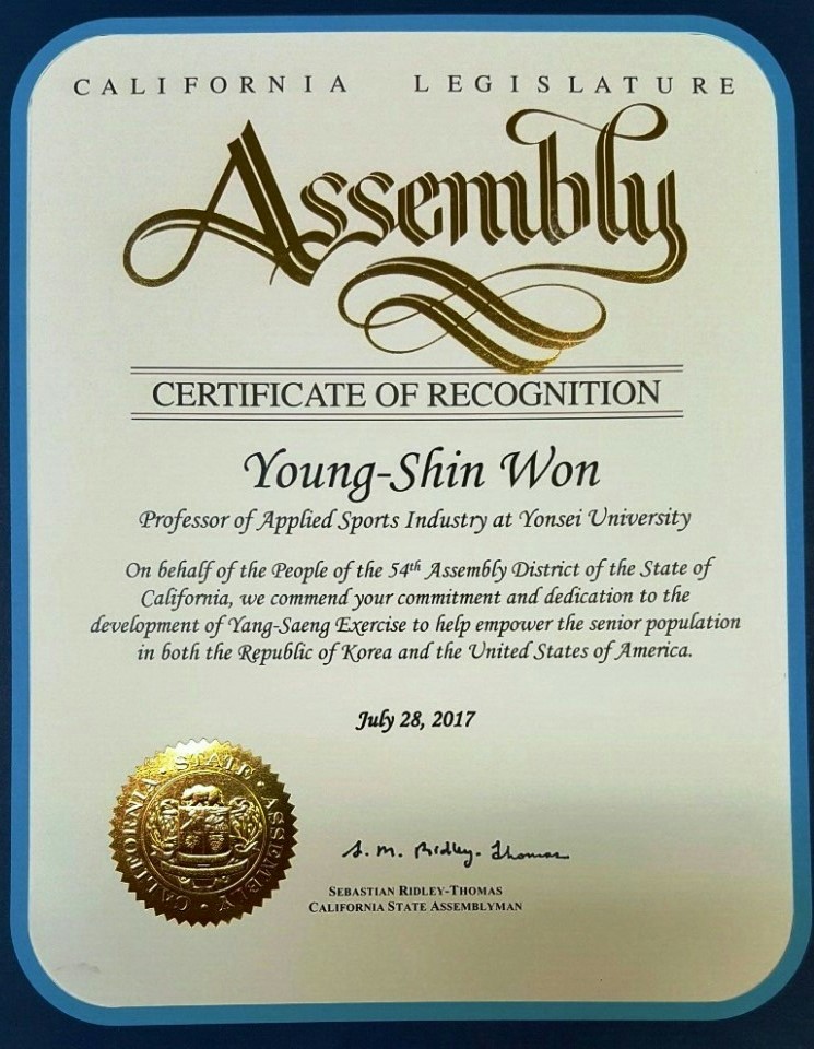 원영신 회장님 캘리포니아 주의회 표창 수여