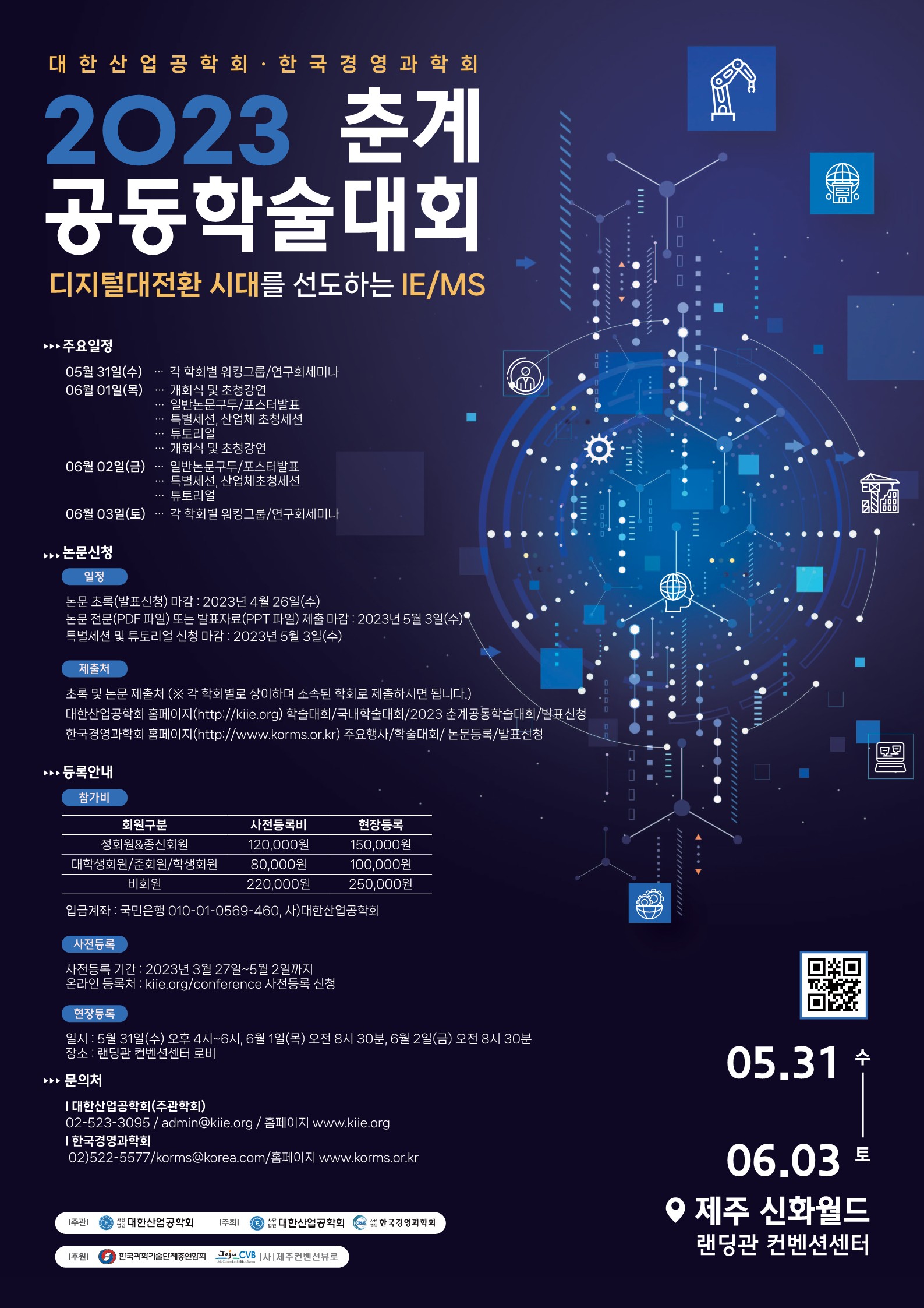 2023년 대한산업공학회/한국경영과학회 춘계공동학술대회가 2023년 5월 31일(수) ~6월 3일(토)에 제주신화월드에서 개최됩니다.