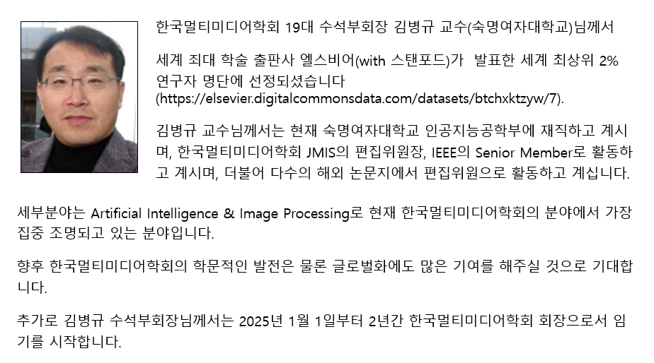 김병규 수석부회장(숙명여자대학교) 전 세계 상위 2% 연구자 선정