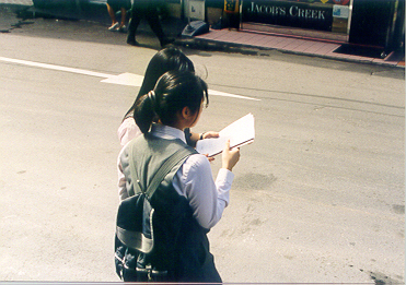 2004년 9월 15일, 강남 중학교 '사회 참여 체험 학습의 날'에 신문로 지역(10조) 거리 간판 조사를 하고 있는 모습. 이 날 간판 조사를 하면서 어느 가게에 들어 갔다가 불친절한 종업원을 만나고 나와서 힘들어했던 친구들....