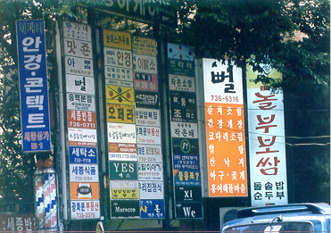 2004년 9월 15일, 강남 중학교 '사회 참여 체험 학습의 날'에 광화문 한글 학회 이웃 지역에 있는 세종빌딩 안에 있는 가게이름들... 대부분 한글로 적고 있는데 몇몇 가게들은 로마자만 쓴 곳도 있군요.