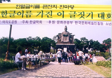 2004년 9월 4일, 여의도에서 있었던 제1회 한글이름 가진 이 글짓기 대회 개회 모습. 멀리 김 계곤 회장님이 말씀하시는 모습이 보인다.