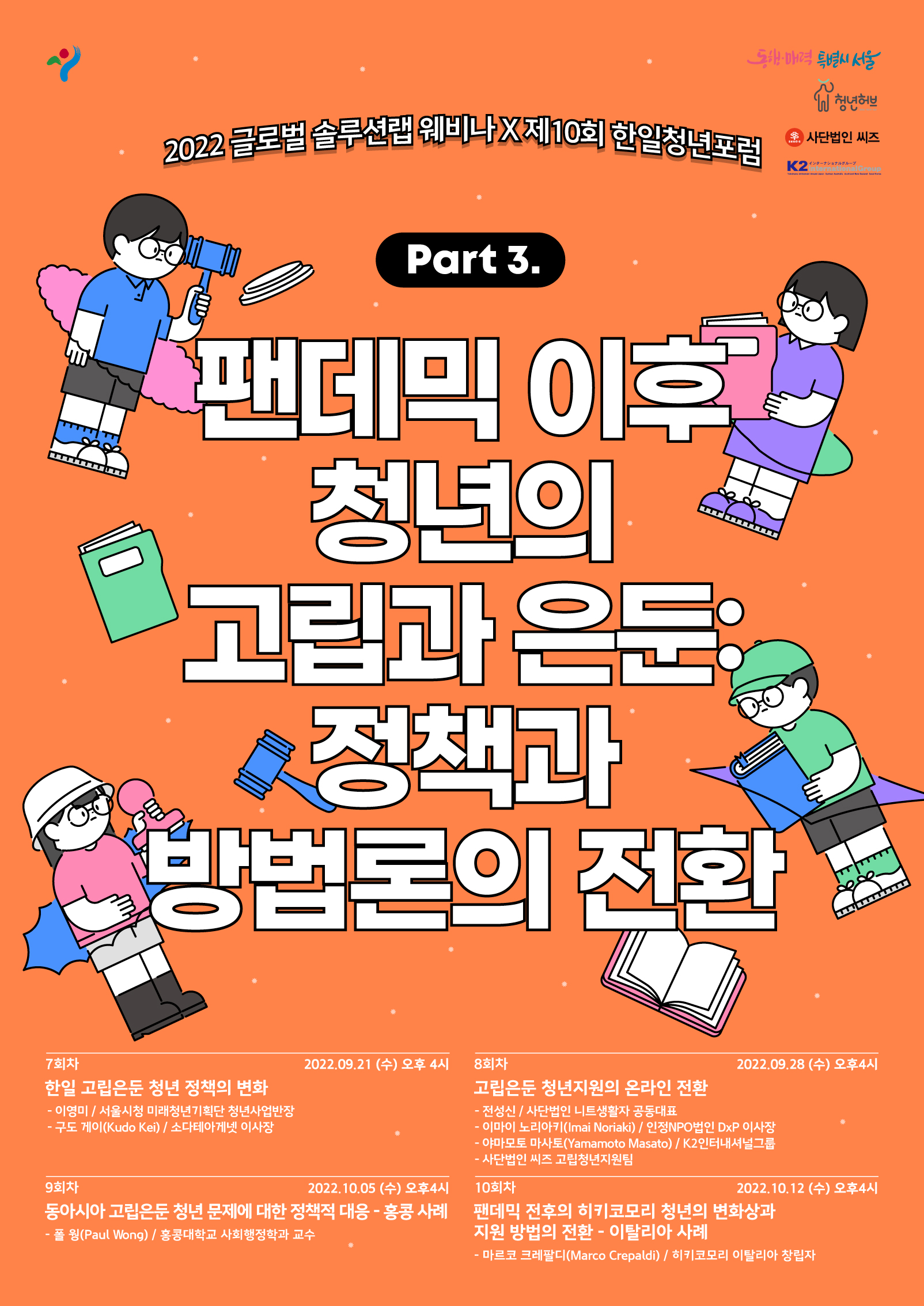 3부는 팬데믹 사태 이후청소년  청년의 고립은둔 문제에 대해 어떠한 정책 패러다임의 변화와 현장 지원기관의 방법론적 전환이 있었는지 살펴보기 위해 한국일본홍콩이탈리아의 전문가들을 모셨습니다