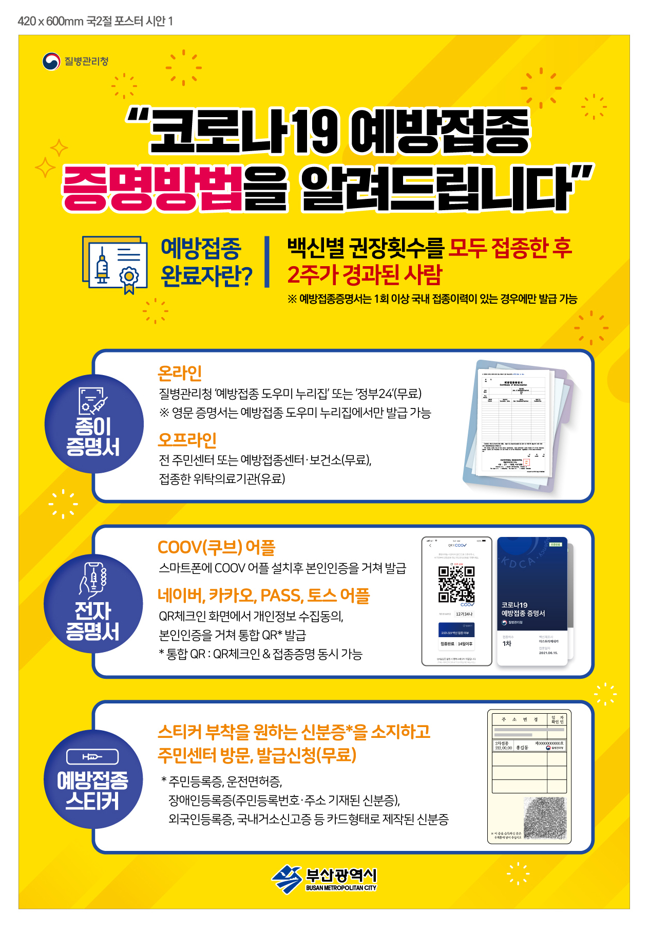 - 인정자료 : 전자증명서(COOV앱), 종이증명서(보건소, 예방접종도우미 사이트에서 발급 可), 신분증에 부착된 예방접종스티커 중 택 1
