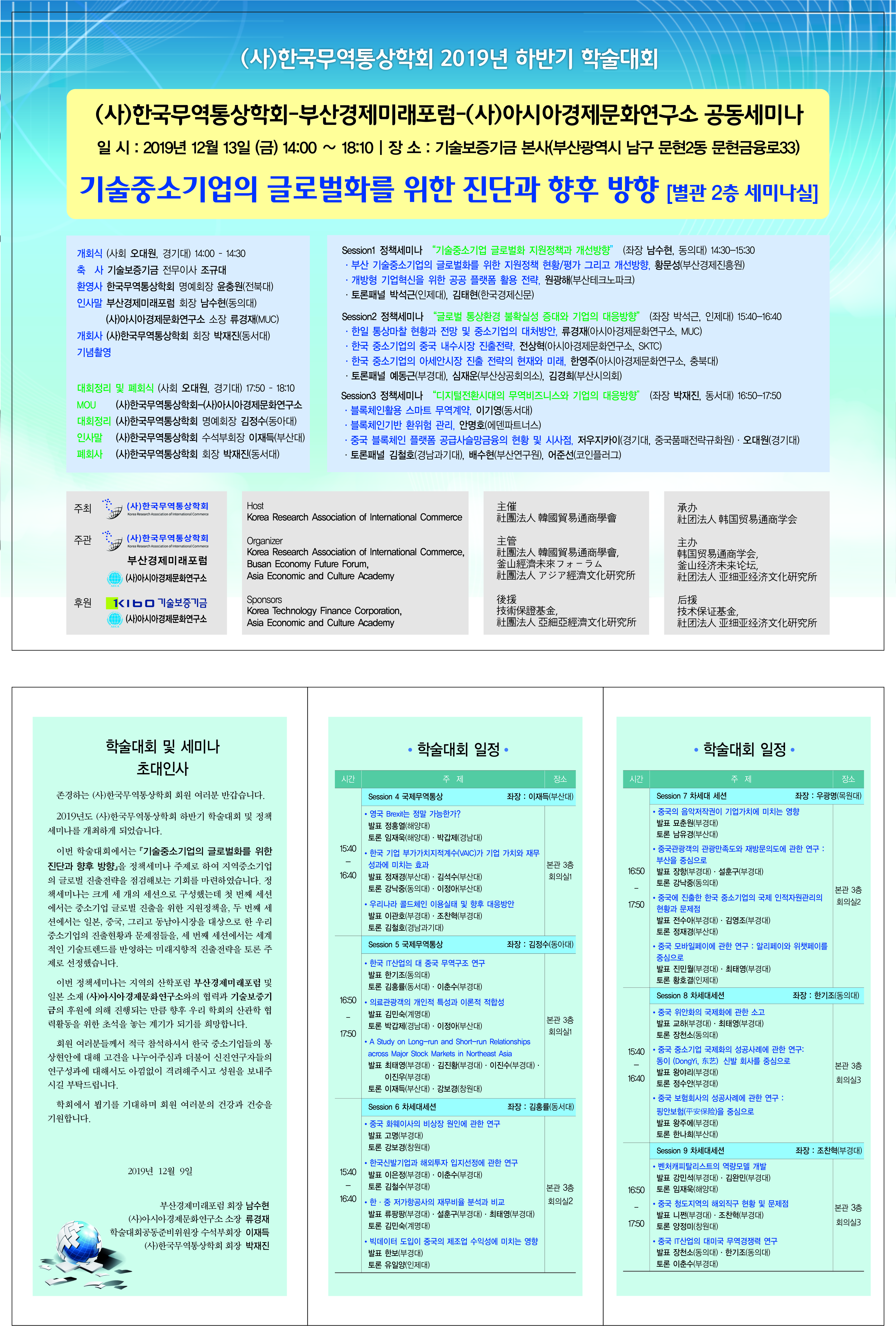 주 제 : 기술중소기업의 글로벌화를 위한 진단과 향후 방향 일 시 : 2019년 12월 13일 (금) 14:00 – 18:10 장 소 : 기술보증기금 본사 (BIFC빌딩, 부산광역시 남구 문현2동 문현금융로33) 주 관 : (사)한국무역통상학회, 부산경제미래포럼, 社團法人 亞細亞經濟文化硏究所 후 원 : 기술보증기금 |