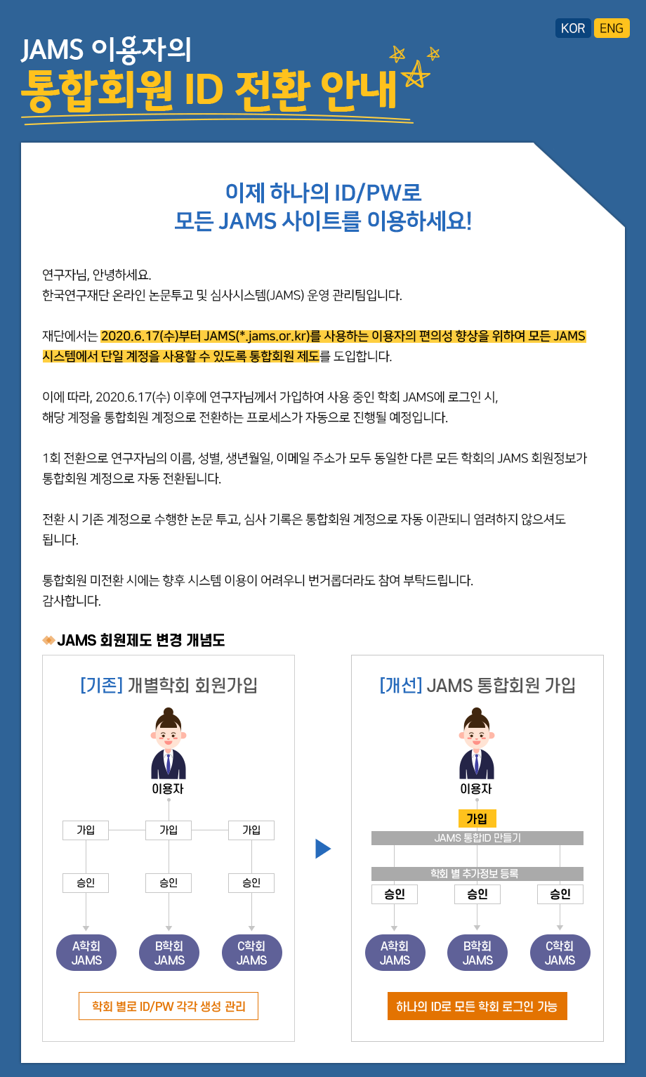 *2020년 6월 17일 이후 JAMS 통합회원 제도 실행으로 인해, 학회별 각각의 아이디로 가입하던 기존의 방식에서 하나의 JAMS 아이디를 이용해 각 학회에 접근할 수 있도록 시스템이 변경되었습니다. 자세한 내용은 첨부된 안내문을 참조해주시기 바랍니다.