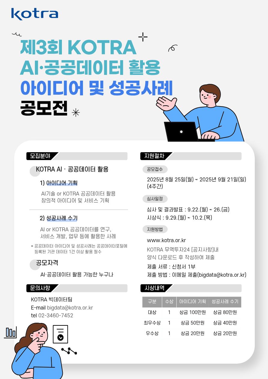 ◦ 공모분야: AI·공공데이터를 활용한 KOTRA 대국민 서비스 및 무역·투자진흥 관련 ①성공사례 수기, ②아이디어 기획