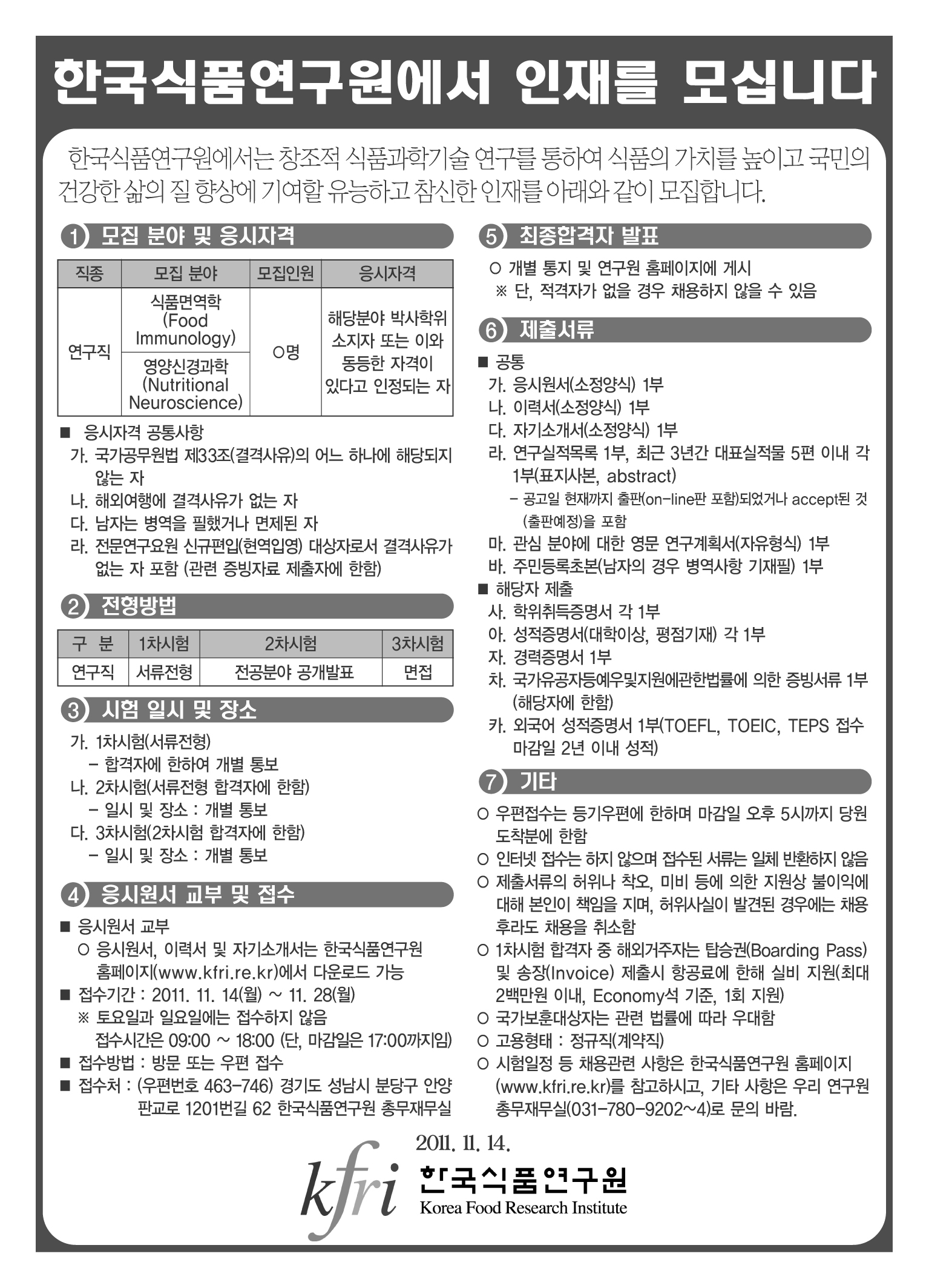 [한국식품연구원] 2011년도 직원채용 공고