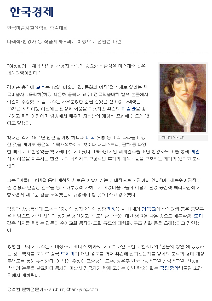 5월 12일 개최된 한국미술사교육학회 제22회 전국학술대회에 관한 기사가 한국경제신문에 실렸습니다.화면이 잘 보이지 않으실 경우 Ctrl 키를 누르신 상태에서 마우스 휠을 돌려 조절하시면 확대 축소하여 보실 수 있습니다.