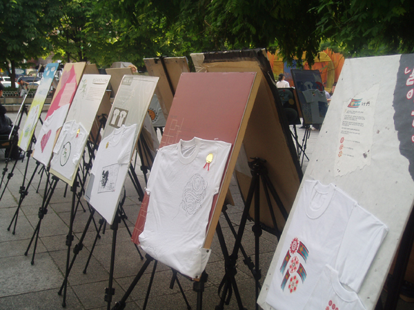 2005년 10월 5일 (수) 오전 11시부터 서울 세종문화회관 분수대광장에서 있었던 한글날 기념 '한글무늬옷(한글티셔츠) 공모 작품 전시와 나눠주기' 행사의 한 모습입니다. <찍은 이: 꿈돌이, 2005년 10월 5일.>