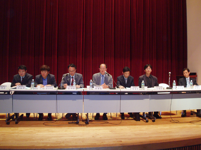 2005년 6월 2일 (목) 오후 2시부터 서울역사박물관 강당에서 있은 '국어상담소 운영을 위한 공개 토론회'에서 제1부 발표 시간에 발표한 주제에 대해 토론할 이들의 모습. 왼쪽부터 최동주(영남대), 김두루한(광양고), 송기형(건국대), 권재일(사회자, 서울대 교수), 안상순(금성출판사), 김태환(서울대 글쓰기연구실), 남영신(발표자, 국어문화운동) 선생님. <찍은 이: 꿈돌이, 2005. 6. 2.>