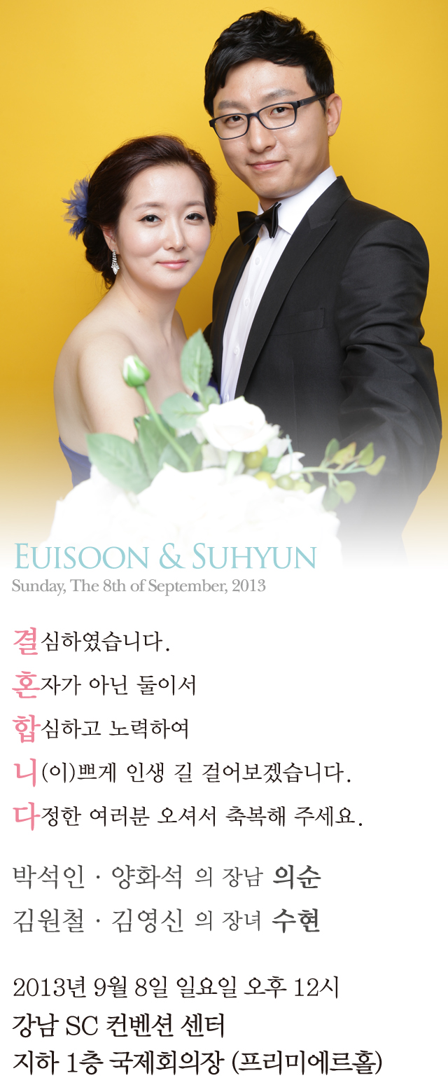 우리학회 정회원이신 김원철 박사님의 장녀 결혼을 알려드립니다. * 일시 : 2013년 9월 8일 일요일 낮 12시* 장소 : 강남SC컨벤션센터 지하1층 국제회의장 프리미에르홀(서울 강남구 역삼동 소재)첨부 : 청첩장 1부. 약도 1부. 끝.