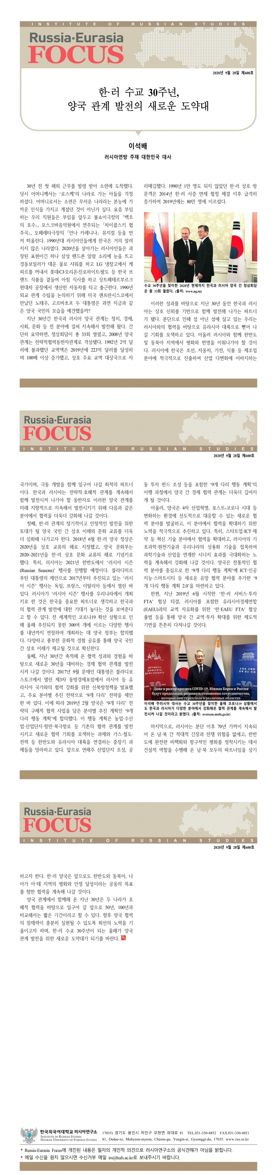 제600호 한·러 수교 30주년, 양국 관계 발전의 새로운 도약대