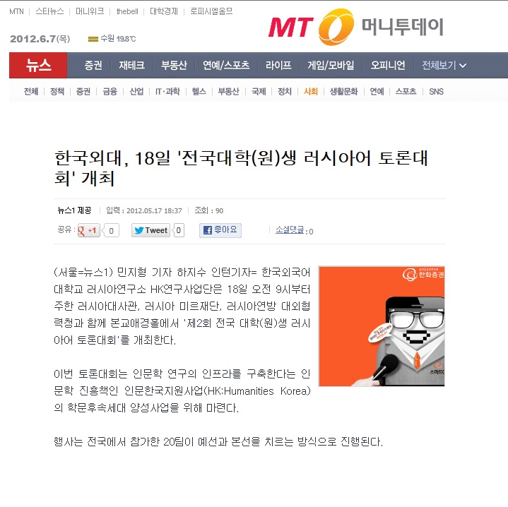 [언론보도]한국외대, 18일 '전국대학(원)생 러시아어 토론대회' 개최-머니투데이(2012.05.17
