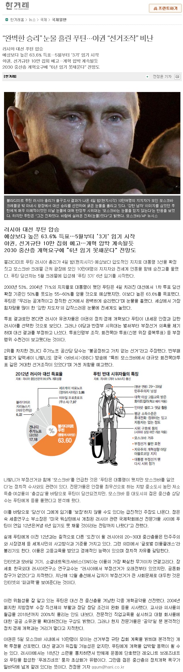 [언론보도]“완벽한 승리” 눈물 흘린 푸틴…야권 “선거조작” 비난-한겨레(2012.3.5)