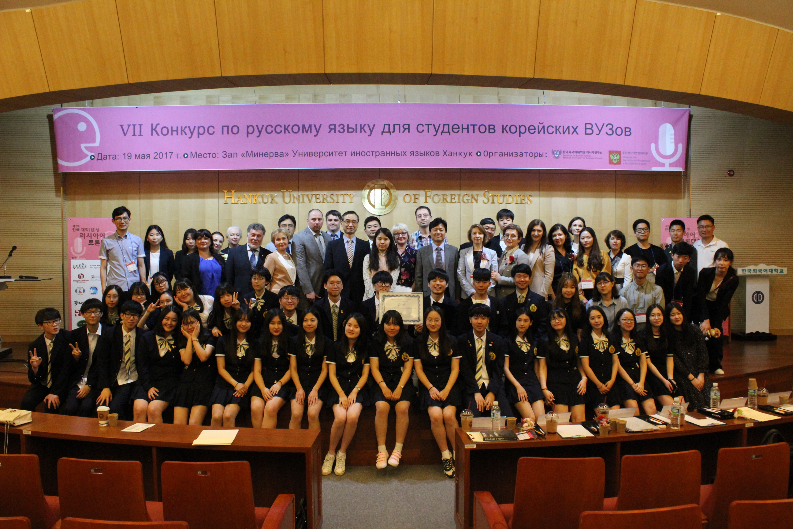 2017년  5월  19(한국외대 러시아연구소 (소장 강덕수 )는 서울캠퍼스 미네르바 콤플렉스 국제회의실에서  <7회 전국 대학 ()생 러시아어 토론대회 >를 개최했다 러시아연구소는 러시아어에 관한 전국 대학 ()생들의 관심을 제고하고 재능 있는 학생들을 지원하고자  2011년부터 매년 본 토론대회를 개최해왔다 특히  2015년부터 대회를 주한러시아연방 대사관과 공동으로 주관 전국 규모의 관심을 이끌어냈다 해마다 토론대회에 참가하는 학생 및 출신교 수가 증가하고 참가자들의 러시아어 수준이 높아진다는 점은 본 토론대회가 이미 국내 러시아어 교육인과 학생들에게 대표적인 소통의 장으로 자리 잡았다는 것을 의미한다 . 6회 대회에 이어 수원외고 학생들이 특별 초청되었고 책을 매개로 교수와 학생이 소통하는 자리인  <책 나눔 한마당 >이 마련되었다 .