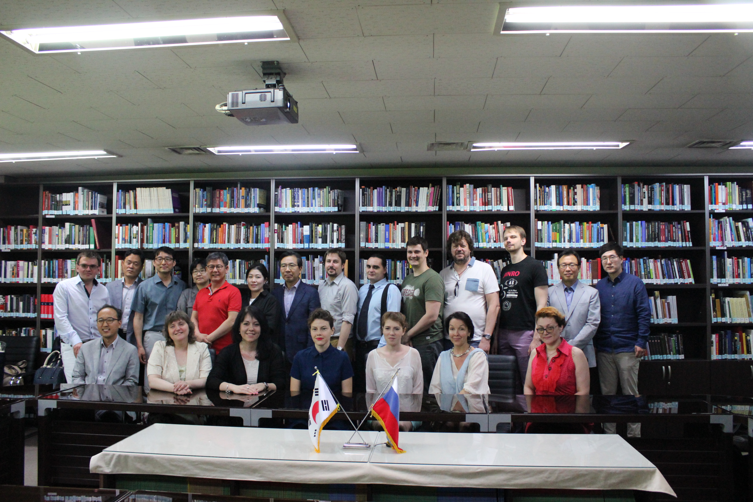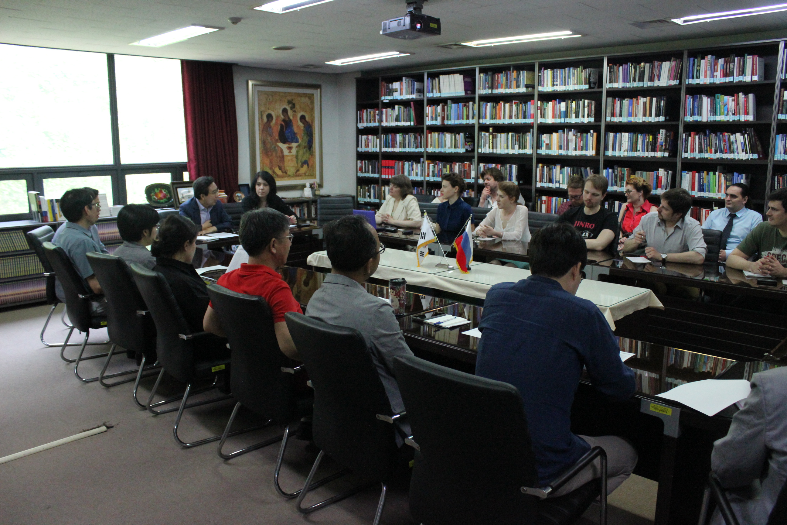 한국국제교류재단 (Korea Foundation)  초청으로 방한한 러시아의 한국학 학자 예카테리나 포홀코바 모스크바 국립언어대 교수 아나스타시아 구리예바 상트페테르부르크국립대 동방학대학 교수 등 러시아 학자  14 명이 지난  6 월  8 ( 한국외대 러시아연구소를 방문하여 간담회를 가졌다 이들 러시아의 한국학 연구자들은 김현택 러시아연구소장 및  HK 팀원들과 러시아연구소의 활동 및 한국 내 러시아학 연구 동향에 관한 의견을 교환하였다 이 자리에서 러시아 학자들은 냉전 시기 러시아연구에 필요한 러시아어 자료의 입수했는지 최근 한국 연구자들의 국제저널 논문투고 경향 등에 관한 질문을 던지는 등 한국 내 러시아연구자들의 연구활동에 깊은 관심을 표명하였다 그 외에 양측은 향후 러시아 내 한국학 연구자들과 한국 내 러시아 연구자들의 학술협력에 대해 논의함으로써 뜻 깊은 대화가 오간 간담회를 마무리하였다 .