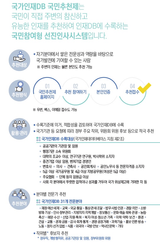 인사혁신처에서 국가인재DB에 수록하여 정부인사에 활용될 '과학기술' 분야 전문가 추천을 요청하였습니다.