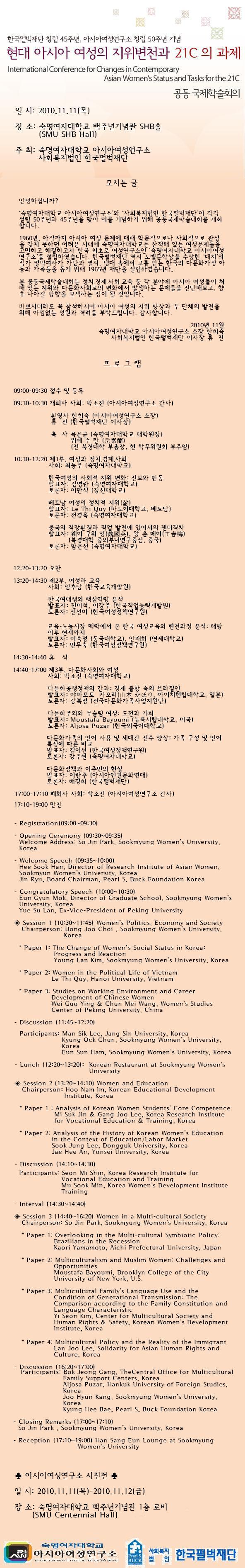 [2010 아시아여성연구소 50주년 기념 국제학술회의] 현대 아시아여성의 지위변천관 21C 과제