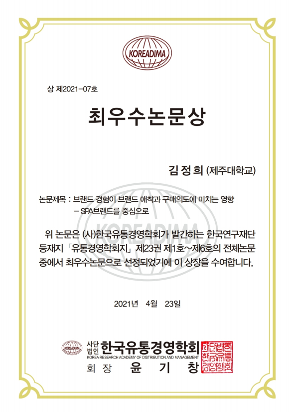 - 최우수논문상: 김정희 교수(제주대)