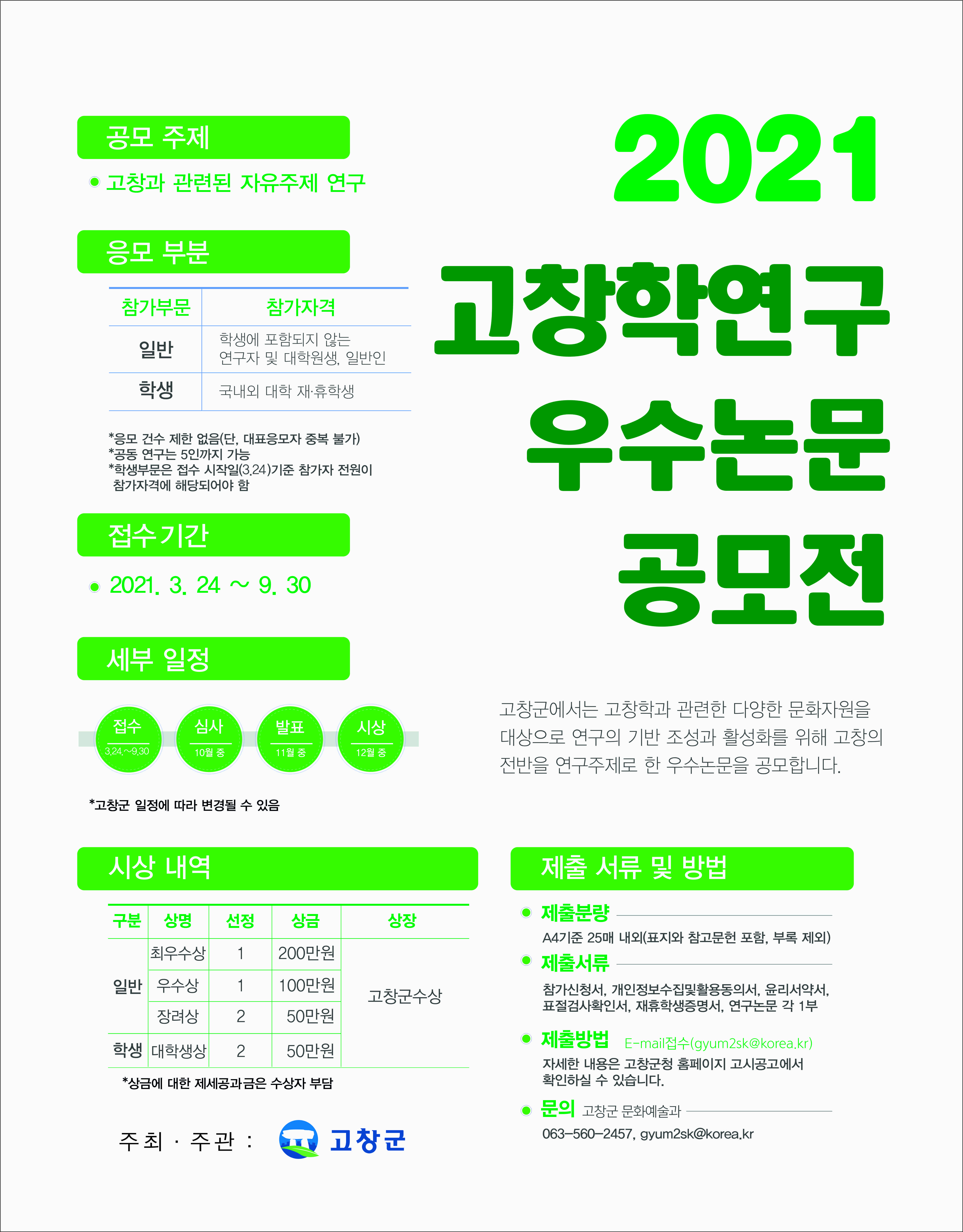 - 발표 및 시상: 2021. 11월 중, 고창군 홈페이지 고시공고