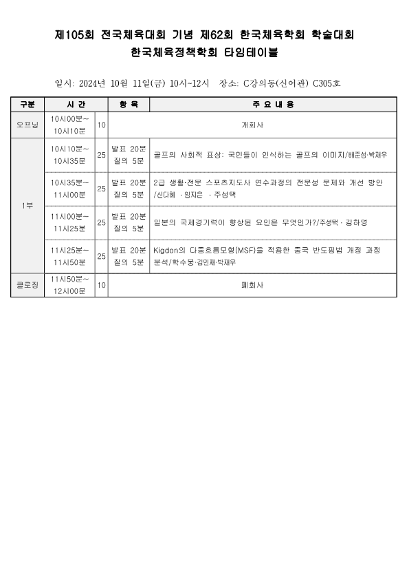 [행사] 제105회 전국체육대회 기념 제62회 한국체육학회 학술대회 분과학회 일정표