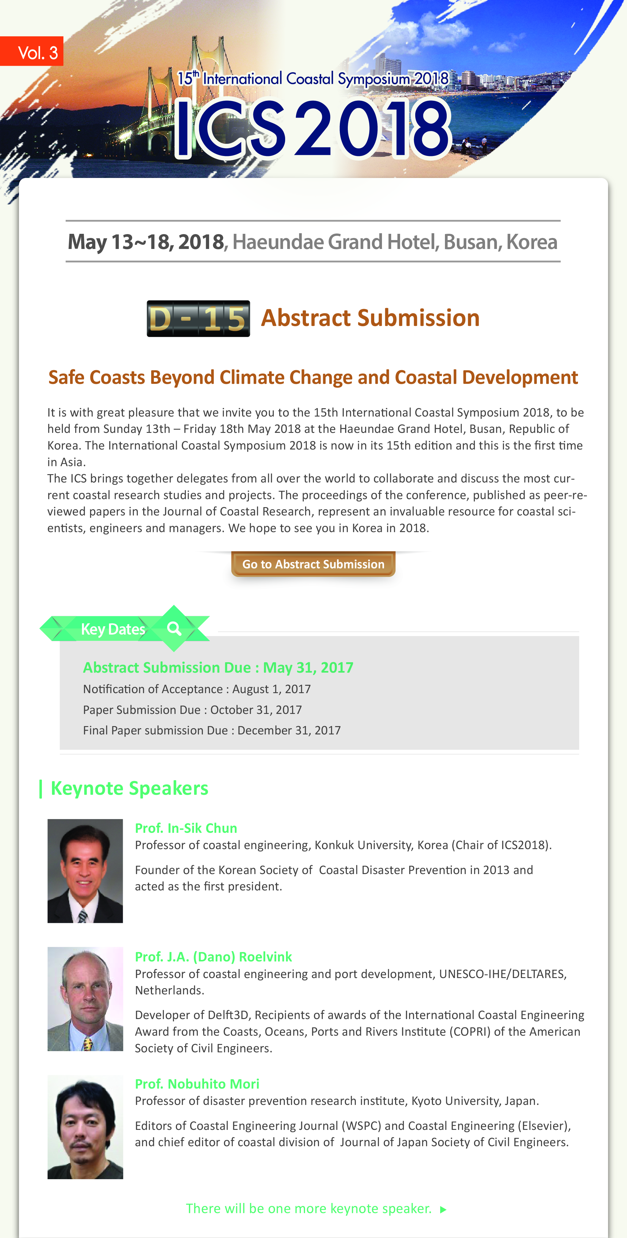 아시아에서 처음으로 개최되는 제15회 국제연안심포지엄(ICS2018)이오니, 관심 있는 분들의 많은 참여 바랍니다.