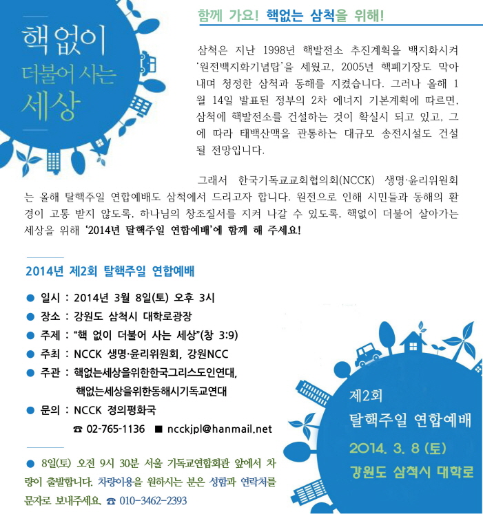 NCCK 생명 윤리위원회 주최 탈핵주일 연합예배가 3월 8일 삼척에서 '핵없이 더불어 사는 세상'이란 주제로 열립니다.