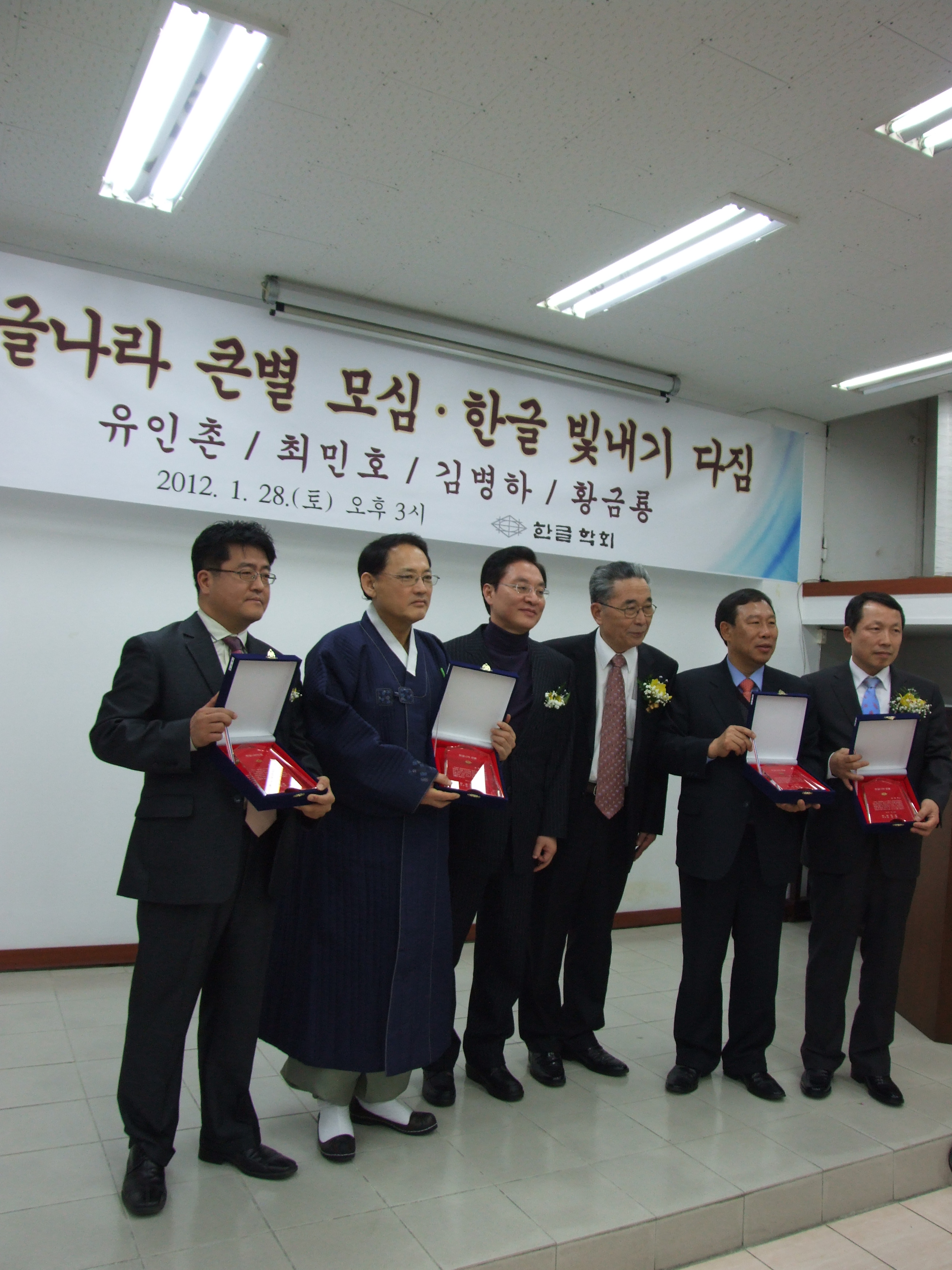 ▲ 2012년 1월 28일(토) 오후 3시부터 한글회관 강당에서 열린 '한글나라 큰별 모심/한글 빛내기 다짐'의 자리에서 한글나라 큰별 보람패를 받은 분들과 축하말씀을 해 주신 정 두언 의원의 모습(왼쪽부터 황 금룡 님, 유 인촌 전 장관, 정 두언 의원, 김 종택 회장, 최 민호 전 청장, 김 병하 전 단장).