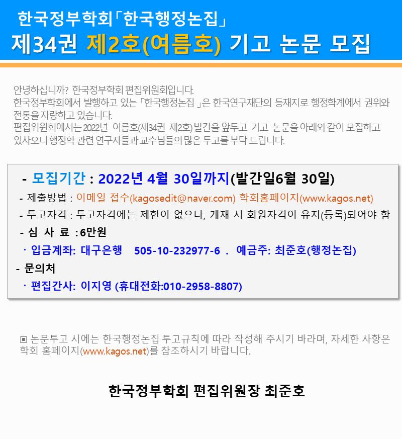 한국행정논집 34권 제2호 논문기고 안내
