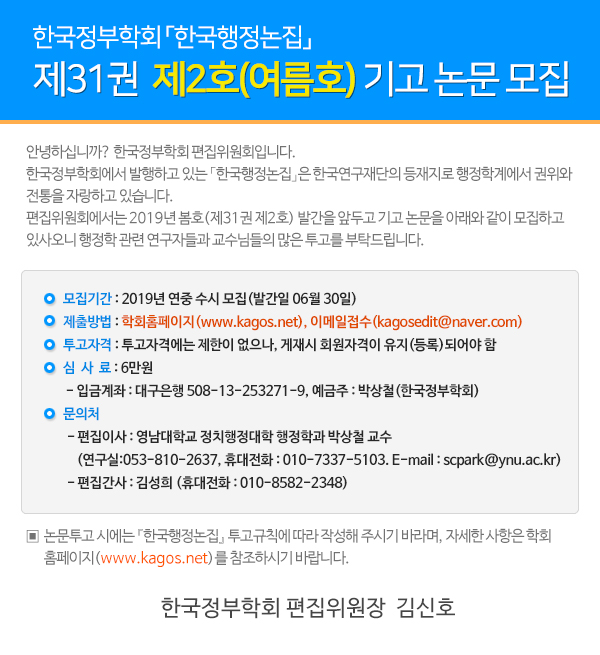 한국행정논집 제31권 제2호 논문기고 공지