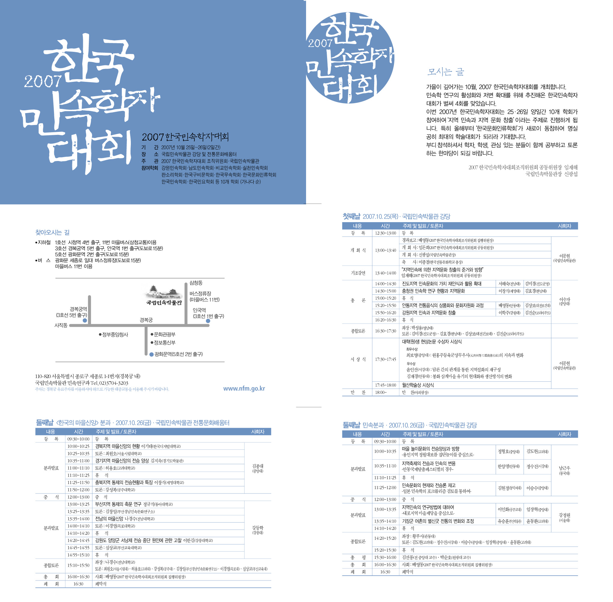 깊어가는 가을과 함께 학문적으로 풍성한 열매를 수확할 수 있는 장을 마련하였습니다. 다름 아닌 오는 10월 25일, 26일 양일간에 걸쳐 국립민속박물관에서 <2007한국민속학자대회>가 개최될 예정입니다. 대회 조직위원회에서는 다양한 주제를 준비하여 여러분들의 지적 욕망을 조금이라도 채워드리고자 노력했습니다.공사로 다망하신줄 아오나 많이 참석하셔서 좋은 학술대회가 될 수 있도록 많은 협조 부탁드립니다. 상세한 대회 프로그램은 첨부화일을 참조바랍니다.환절기에 회원님들께서 항상 건강하시길 기원합니다.