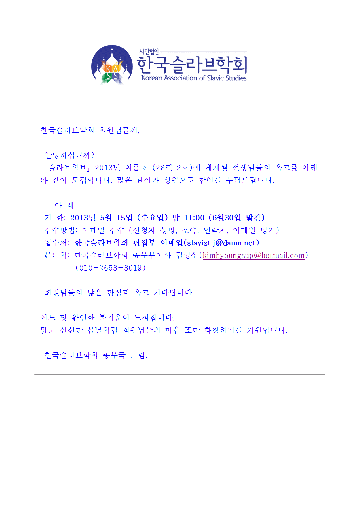 2013 한국슬라브학회 춘계학술대회 안내