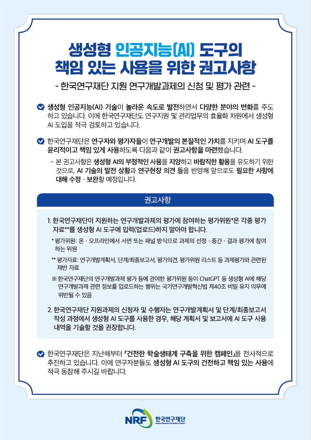 (홍보) [한국연구재단] 생성형 인공지능(AI) 도구의 책임 있는 사용을 위한 권고사항 안내