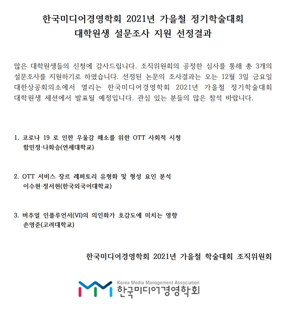 [공지] 한국미디어경영학회 2021년 가을철 정기학술대회 대학원생 설문조사 지원 선정결과